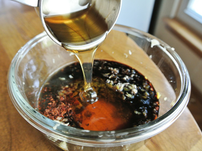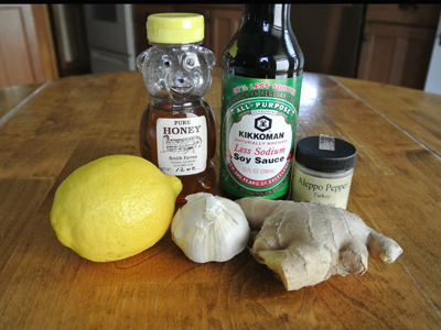 Six tasty ingredients make up the marinade, honey, soy sauce, fresh ginger root, garlic, lemon zest and red pepper flakes. I like the flavor of Aleppo pepper but you use any red pepper flakes or grind your own dried chiles.