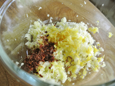 In a medium bowl, combine grated ginger root, grated garlic, lemon zest and red pepper flakes. Add soy sauce and honey. Stir to combine.