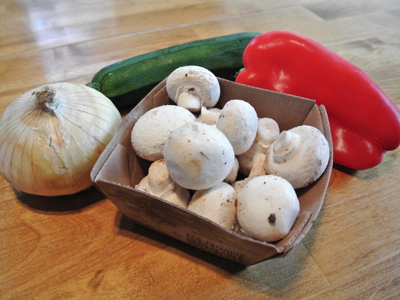 Time to set out the veggies. You can use anything you want but here’s what I chose. Some mushrooms, red bell pepper and a zucchini, plus I’m going to slice a sweet onion. I like the onions sliced and grilled rather than skewered. For some reason I always burn the ends when skewered and this just works better for me.