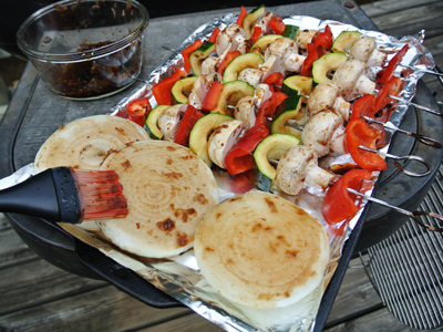 Skewer mushrooms, zucchini and red bell pepper. Using a pastry brush, brush marinade over veggies and onion slices.