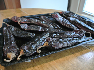 Lay the dried chiles on a cookie sheet and place in a 300 degree oven for 3 – 5 minutes or until the chiles become aromatic.  Be careful not to let the chiles burn.  I also rolled the garlic in aluminum foil and roasted just until soft, about 5 – 10 minutes.