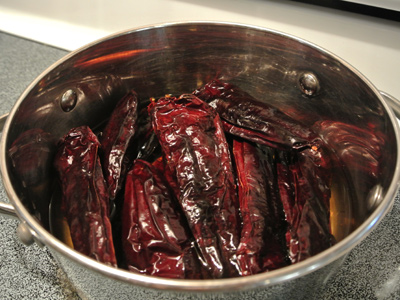 The chiles are soft and colorful red.  I’m going to save the chile water to use later on.