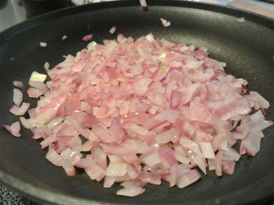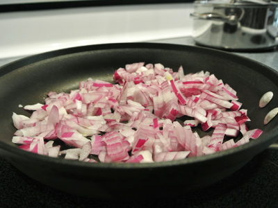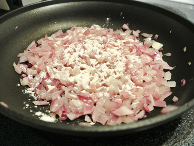 Drizzle olive oil in a pan and saute chopped onion over medium heat until soft and translucent.  Sprinkle in a tablespoon of flour and stir to thicken.