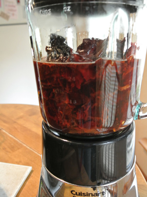 Remove dried chiles from water to a blender.  Add 2 cups of the steeped chile water, sauteed onions and roasted garlic to the blender and puree until you have thick rich sauce.  Strain the sauce to remove the skin and leftover seeds.