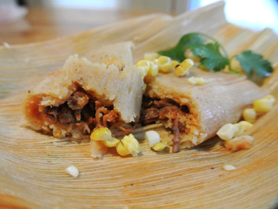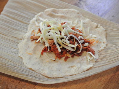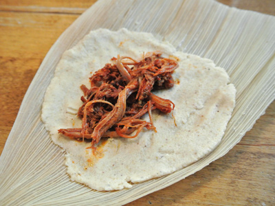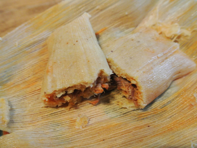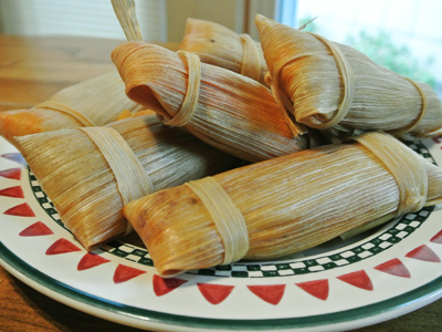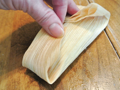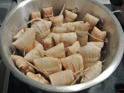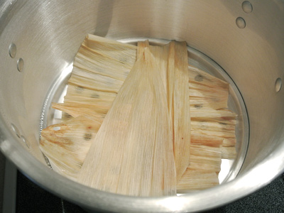 We set up our steamer pot with water in the bottom and placed some soaked corn husks over the insert.  This was a tip from Diana Kennedy’s “My Mexican Kitchen” cookbook.