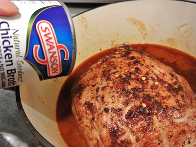 Pour the chile water and a can of chicken broth in with the roast.  Bring to a simmer, cover and cook on low 8 hours or overnight.  Or you can cook 4 – 5 hours over a medium simmer.  Make sure to turn the roast every 2 hours.