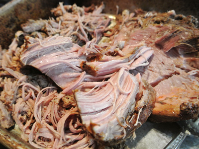 Let the meat cool slightly, remove to a separate pan or bowl and begin to shred the pork with 2 forks.  Add 2 cups of the Colorado red chile sauce to the shredded pork.  Strain the stock to use in the tamale dough or save for another use.  **Note the red sauce will color your masa dough to a reddish orange appearance.