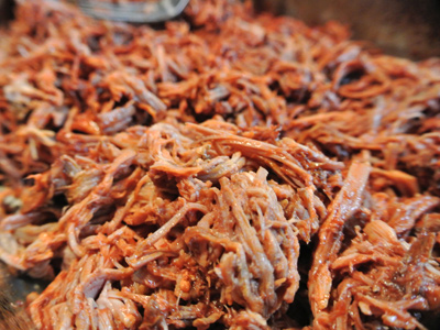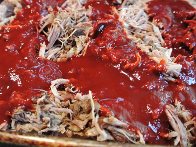 Pour 1 1/2 – 2 cups of Colorado red chile sauce over the shredded pork and mix well.