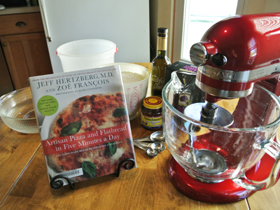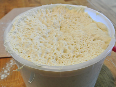 In a large mixing bowl or 5 gallon plastic container with a lid, combine water, olive oil, yeast and salt. Let sit a few minutes while the yeast activates and begins to foam. Measure the flour with the scoop and sweep method and begin adding a cup at a time. Use a wooden spoon to incorporate the flour with the wet mixture. Do not knead, it isn’t necessary. You may need to use wet hands to incorporate the last bit of flour. When everything is uniformly moistened without dry patches, transfer to a 5 gallon container (unless you have mixed your dough in this container) and allow to rise at room temperature, about 2 hours. Do not punch down the dough. With this method try to retain as much gas in the dough as possible. If the dough rises to push the lid off, gently push the dough back inside the container, reseal the lid and place in refrigerator. You may refrigerate the dough up to 2 weeks. The dough will develop sourdough characteristics over that time.