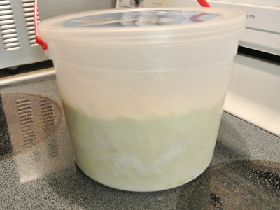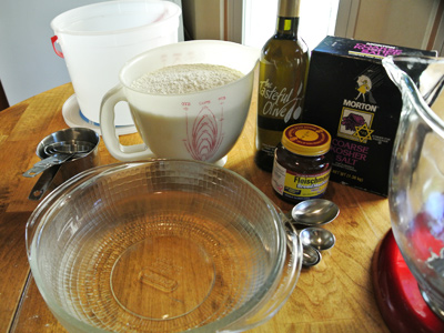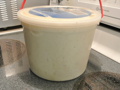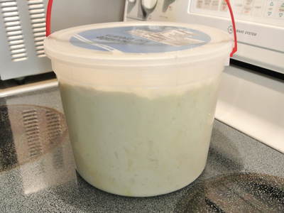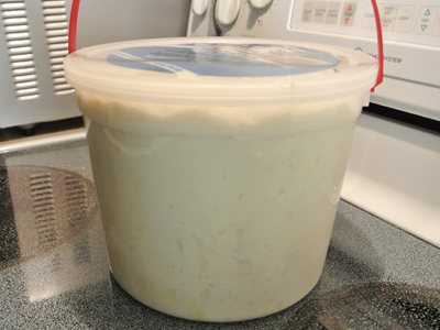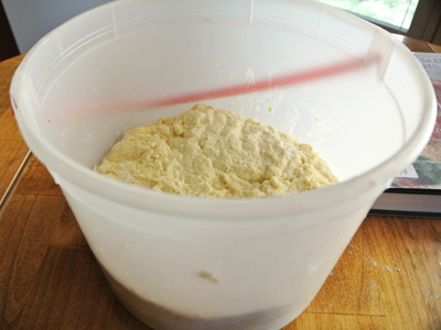 You’ll need a 5 gallon plastic container with a lid. I had a 5 quart ice cream bucket that worked just fine. You can mix the dough by hand in the bucket or use your stand mixer. I’ve made a batch in each and found that it’s just a preference. The stand mixer makes it easier but more cleanup while mixing in the bowl gives you a workout with little cleanup. I made the olive oil version which cuts the water amount to 3 cups plus 2 tablespoons, 1/3 cup olive oil, 1 tablespoon yeast, 1 tablespoon Kosher salt, 7 1/2 cups all purpose flour.