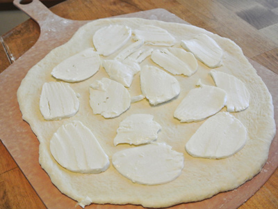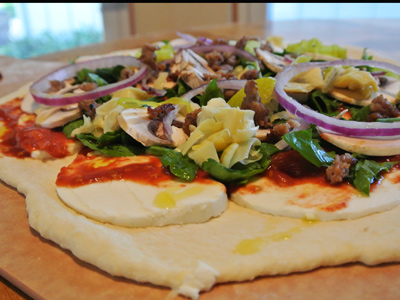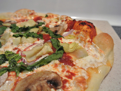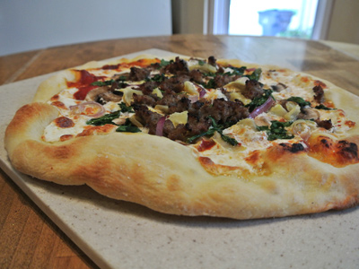 With proper flour and cornmeal underneath your dough it should slide easily from the peel onto the pizza stone. I found that a medium crust took about 7 – 8 minutes while the thicker crust took about 10 minutes.