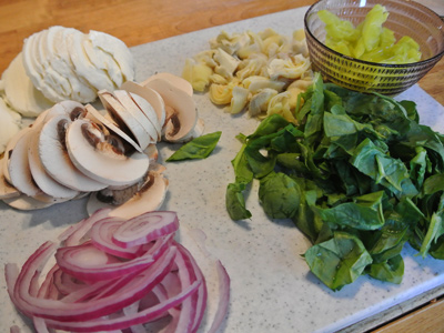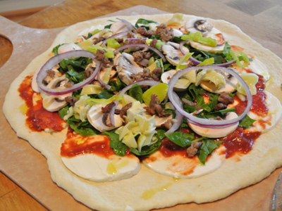 This is where you get to choose whatever toppings you like. I also had some sweet Italian sausage that I browned for those who like meat on their pizza. I’m partial to veggies though, with lots of cheese.