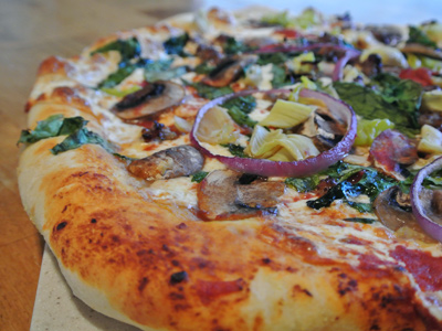 Slide the pizza onto the preheated stone. Place the tip of the peel near the back of the stone, close to where you want the far edge of the pizza to land. Give the peel a few quick forward and back shakes and pull it sharply out from under the pizza. Check for doneness in 7 – 8 minutes, or 10 minutes for a thicker crust. Turn the pizza if one side appears to brown faster than the other. It should be easy to slide the pizza back onto the peel once the pizza has cooked. If necessary, use a spatula to help slide it back onto the peel. Allow to cool slightly, slice and enjoy.