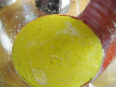 The water should be lukewarm, 100 degrees or below. Mix together the water, olive oil and yeast.