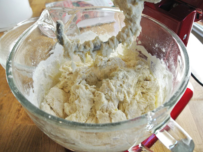 Wet your hands to get the last bit of flour to incorporate it it becomes difficult. Remember, you’re not kneading it, just making sure to uniformly moisten without dry patches.