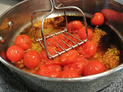 A potato masher makes for quick and easy work. Gently mash the tomatoes but be aware that sometimes those little tomatoes squirt back.
