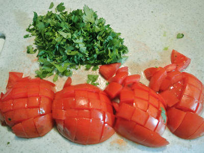 Chop 2 tomatoes and about 1/3 cup of cilantro to add for the last hour of cook time.