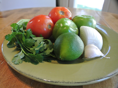 For this salsa I chose tomatoes, tomatillos, onion, garlic, cilantro, lime juice and some green chile (which I forgot to include in the photo).