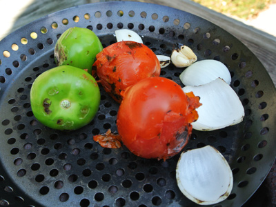 Roast the tomatoes, tomatillos, onion and garlic (and chile if not previously roasted) over the open flame of a gas grill. Alternative methods include roasting either in an ungreased skillet over moderate heat, or they can be placed under a broiler until soft and slightly blackened. Turn often and remove from heat when all sides have been charred.