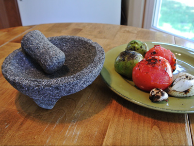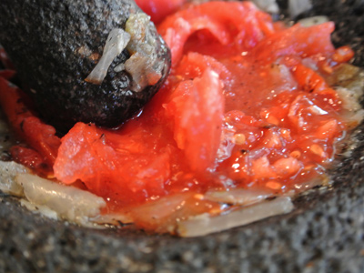 The molcajete is ready to go. I cored the tomatoes and tomatillos but did not peel them. I found that the onion was tough to grind and needed to be chopped up a bit