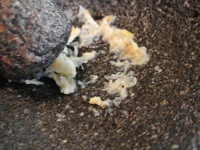 The garlic is soft from being roasted out on the grill and grinds easily into a paste.