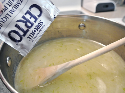 Once the sugar is dissolved, stir in 1 packet (or 3 ounces) of liquid pectin for 1 minute.