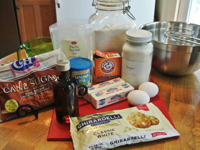 Here’s what’s needed for the cookies. Some butter, flour, sugar, brown sugar, eggs, vanilla extract, baking soda, salt, white chocolate chips, and macadamia nuts.