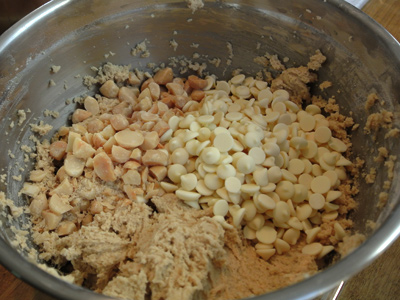 Fold in the macadamia nuts and bag of white chocolate chips to the cookie dough.