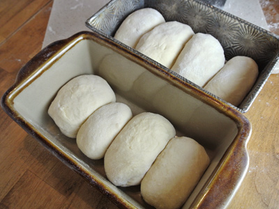 I’m going to then divide each loaf into 4 pieces that will give my bread some shape and look pretty. Take each piece and knead them to fit into the loaf pans.