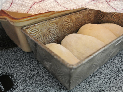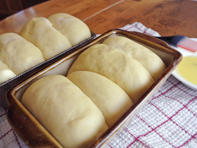 If all goes well your dough will double in bulk and will rise to the top of your loaf pans. Beat an egg and add a tablespoon of water. Brush it over the tops of your loaves to make them golden brown and pretty.
