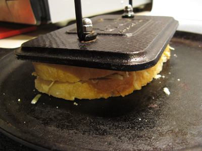 I put the sandwich together and placed the buttered side down on the cast iron griddle while pressing the top side.