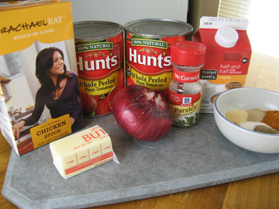 The soup ingredients are canned tomatoes, onion, chicken stock, half and half, butter, spices and parsley. I didn’t have any fresh parsley on hand so I’m going to wing it with dried parsley flakes.