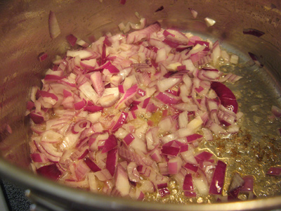 Melt the butter in a large stockpot and saute a large chopped onion.