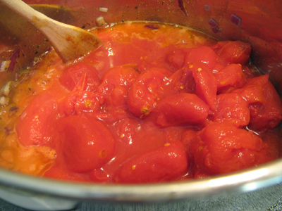 Stir in 2 (28 ounce) cans of whole tomatoes and the remaining spice mix.
