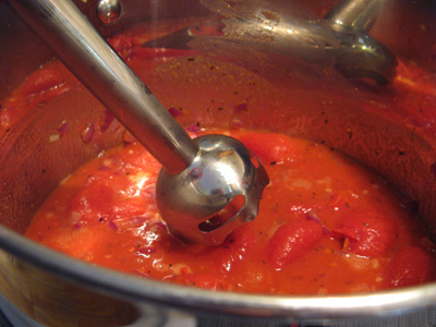 I used my emulsion blender to chop up and blend the soup. In the past I’ve used a blender to puree the tomatoes and onions. Or if you like a chunky soup just use a potato masher to break up the tomatoes.