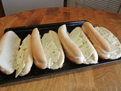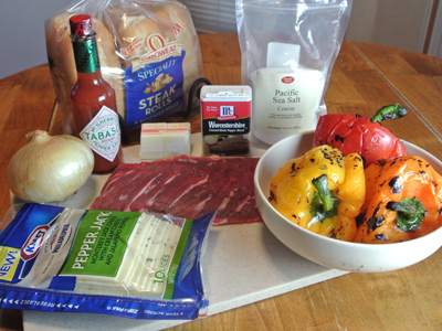 Here are the ingredients I used; a 1 1/2 pound skirt steak seasoned with Worcestershire pepper and salt. Also you’ll want some pepper jack cheese, onion, Tabasco sauce, butter, roasted peppers and steak rolls. Click here for tips on roasting peppers.