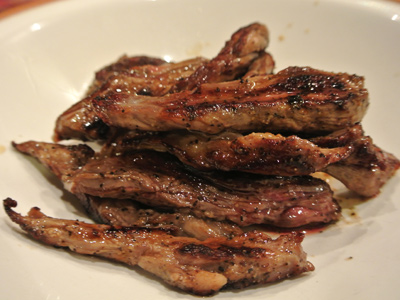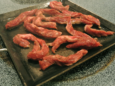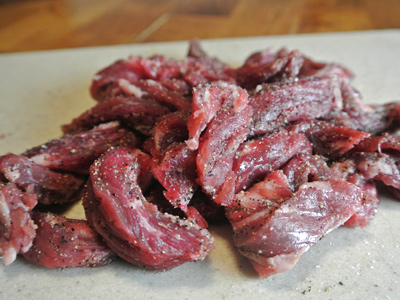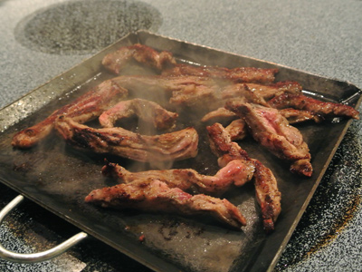 All that seasoning begins to sear into the steak strips. Flip the strips over when they have begun to sear and brown.