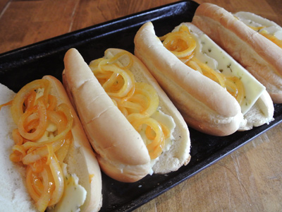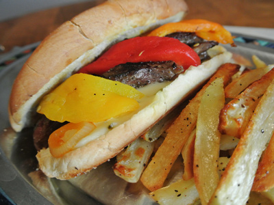 Split 4 steak rolls and begin layering with cheese slices, onions, steak strips, and roasted pepper strips. Toast under a 400 degree broiler for 5 – 7 minutes or until cheese has melted and bread has toasted.
