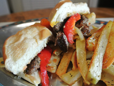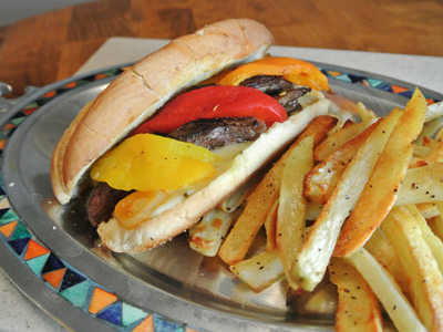 Oven baked fries alongside makes this cheese steak hoagie a meal!