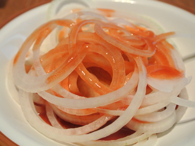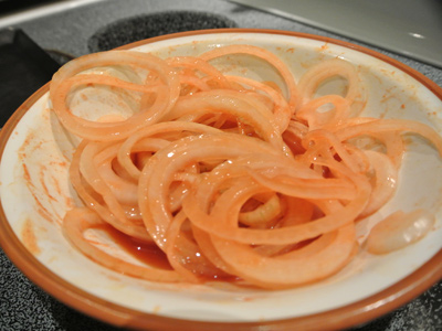 I soaked the onion slices in Tabasco sauce for a half hour or so to infuse that spicy vinegary flavor. Thinly slice 1/2 large onion and separate the rings. Pour 1/4 cup of Tabasco sauce over top.