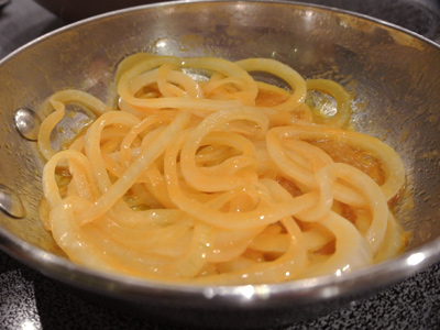 In a medium saucepan, heat 2 tablespoons butter and add the infused onion slices. Saute over medium heat.