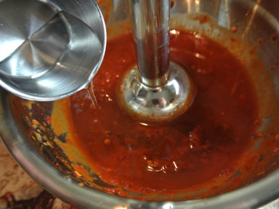 Use a blender or hand emulsion blender to combine the sauce ingredients.  Test sauce for thickness and taste. If too thick, add a little water.  If the sauce requires more vinegar, add in 1/2 tablespoon increments until you have the desired taste.