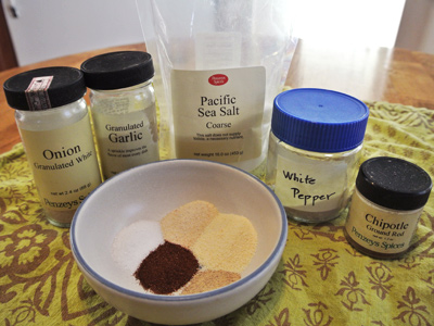 Here’s a spice blend to season the wings. Some salt, onion powder, garlic powder, white pepper and ground Chipotle.