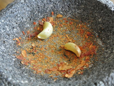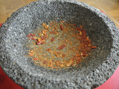 I found it’s easier to crush the chiles a little before placing in the molcajete.  Begin grinding two chiles in a circular motion.  I always leave in a few seeds but if you like it hotter, leave them all in.