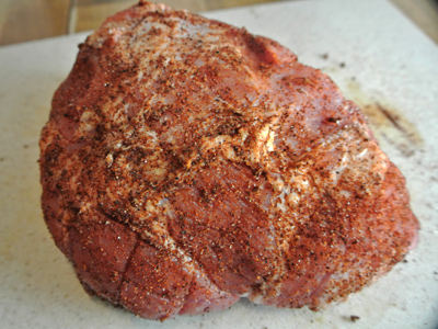 I have a pork roast about 2 3/4 pounds and made a rub of salt, ground Ancho chili and Black & Red spice to season and sear into it.