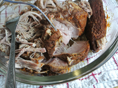 Season pork roast with Chipotle Seasoning Rub over all sides. Drizzle olive oil in a dutch oven and sear the roast. Pour the Chipotle marinade over the roast, turn the heat down to low or place in a 300 degree oven. Slow roast the pork for 4 – 5 hours, turning every hour. To test when ready, place a fork in the roast and when it easily pulls apart, it’s ready. Remove to a bowl and gently pull apart with 2 forks.