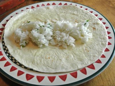 I’m going to begin with a large flour tortilla and some cilantro lime rice.