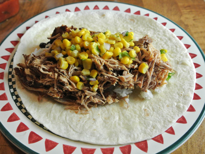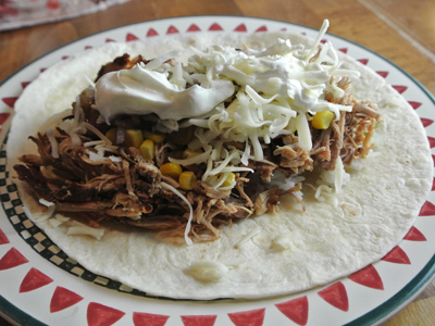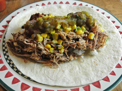 Time to let the stuffing begin. We have carnitas pork, with cilantro lime rice, black beans, Monterey Jack cheese and sour cream. The salsa choices are Chile de Arbol salsa, verde salsa, corn salsa and guacamole. I love choices!