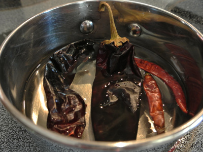 Place the dried chiles in a saucepan with 1 1/2 cups water. Heat the water just to steaming, remove from heat, cover, and let steep 20 minutes.