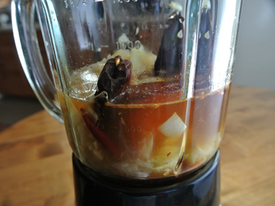 In a medium sauce place dried chiles in water and bring to a simmer. Turn the heat off, cover and let chiles steep 20 minutes. Drizzle olive oil in a small pan and saute chopped onion over medium high heat until soft and translucent.